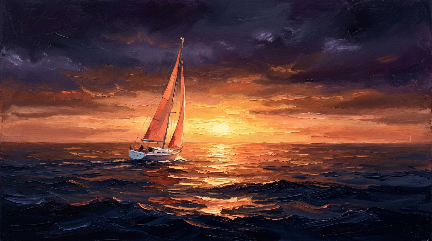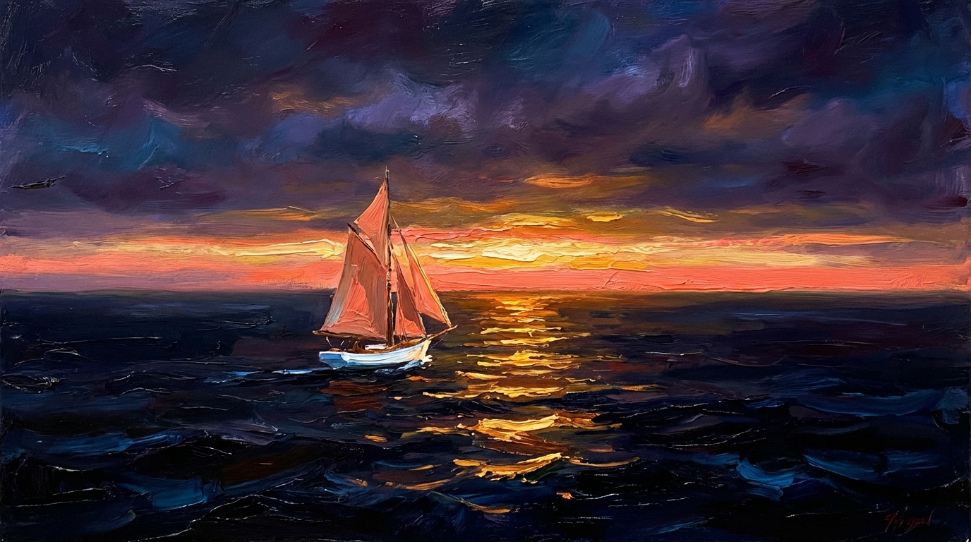 Not photographs. Not illustrations. Not the clean vector graphics that every tech company uses. Actual painted textures, generated through AI but guided by hand. Dozens of iterations. Warm light breaking through clouds. A sailboat at dawn.